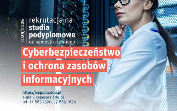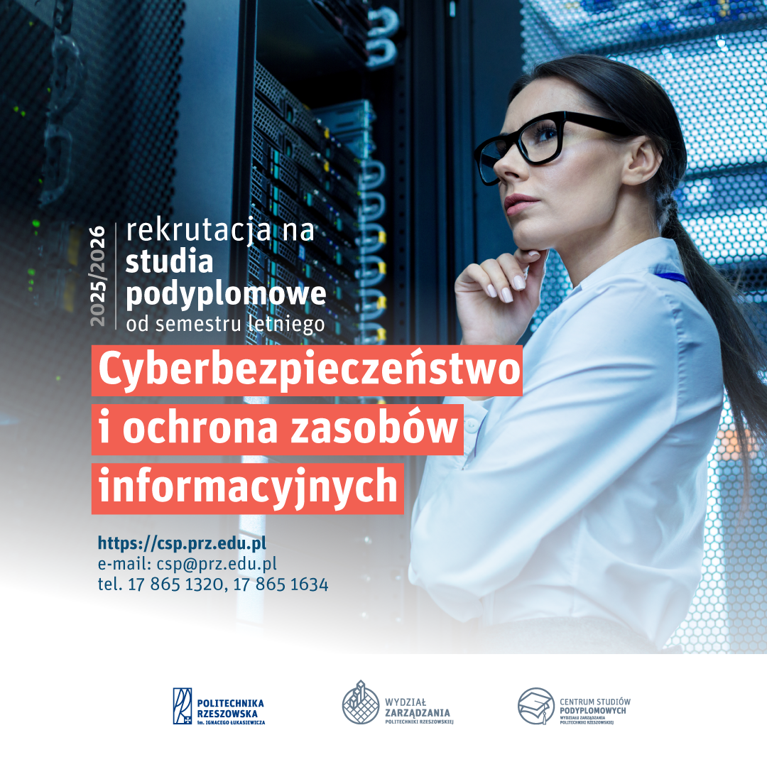 Trwa rekrutacja uzupełniająca na 4. edycję studiów podyplomowych Cyberbezpieczeństwo i ochrona zasobów informacyjnych, realizowanych w Centrum Studiów Podyplomowych Wydziału Zarządzania, we współpracy z Wydziałem Elektrotechniki i Informatyki Politechniki Rzeszowskiej im. Ignacego Łukasiewicza.